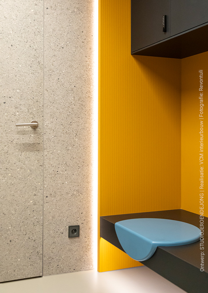 Het gele decor UB53 in combinatie met de voelbare lijnenstructuur in de Riga collectie van Cleaf doet denken aan zomerse zonnestralen die het interieur verwarmen.